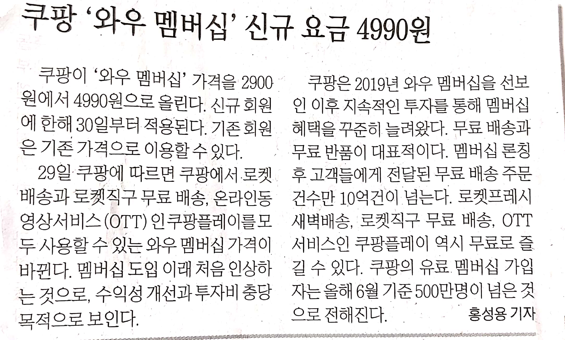 5. 쿠팡 '와우 멤버십 ' 신규 요금 4990원